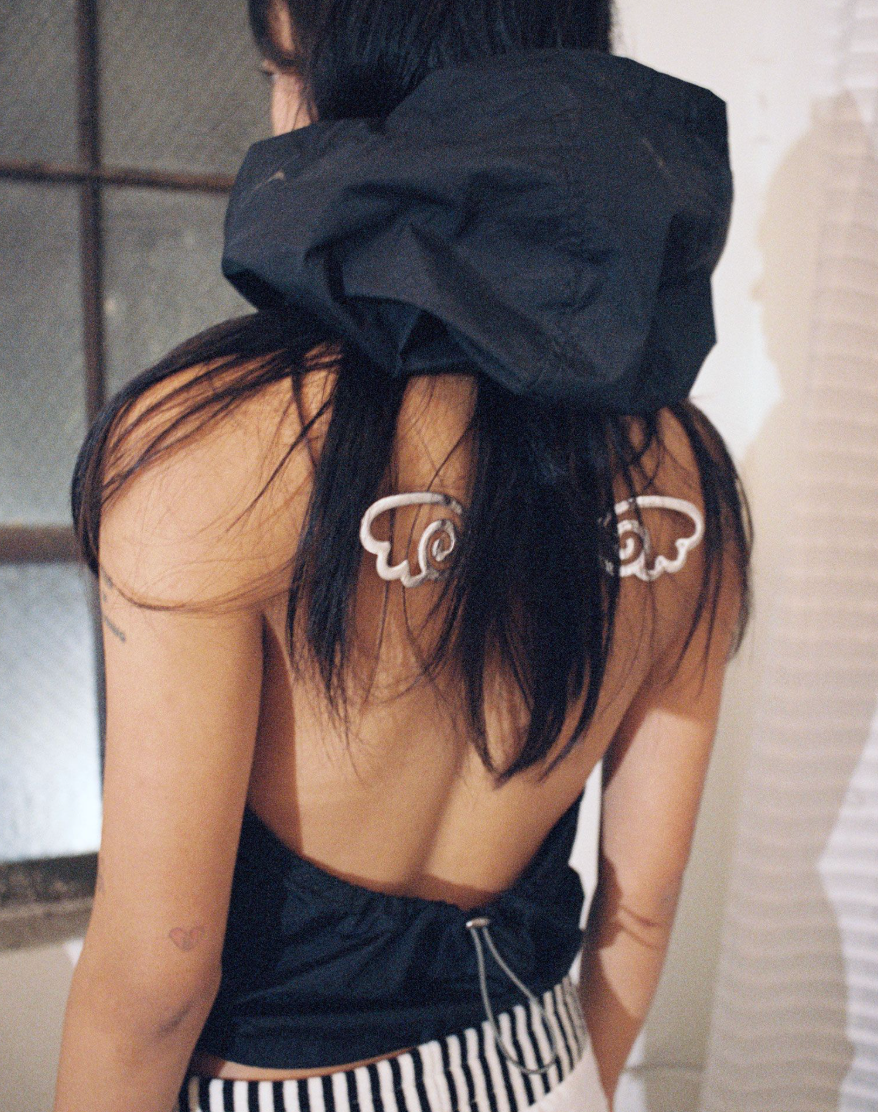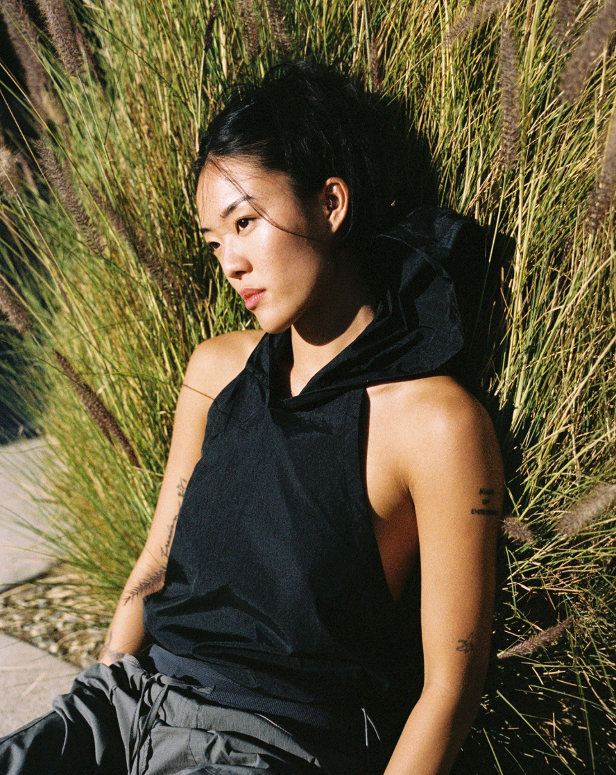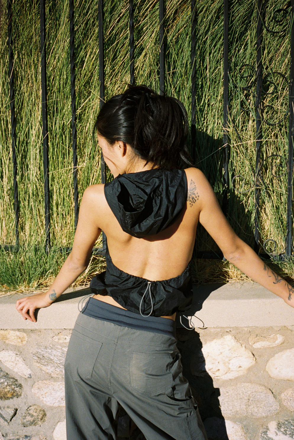 The 2.0 version of our hooded top. She's backless now with adjustable cord at the hood, hem, back to hug your body.