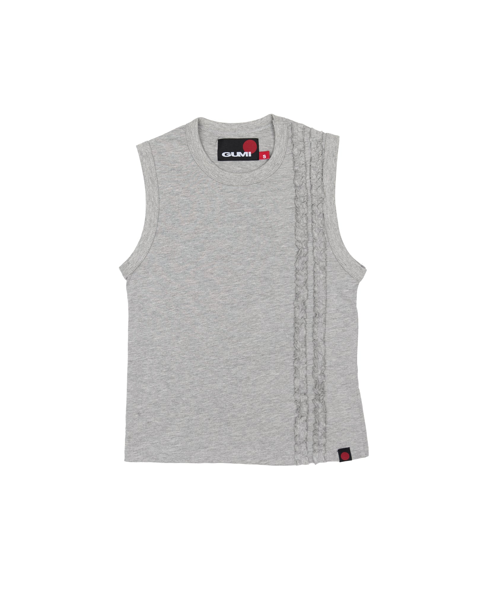 Sleeveless tank. Double ruffles adorn your left chest.