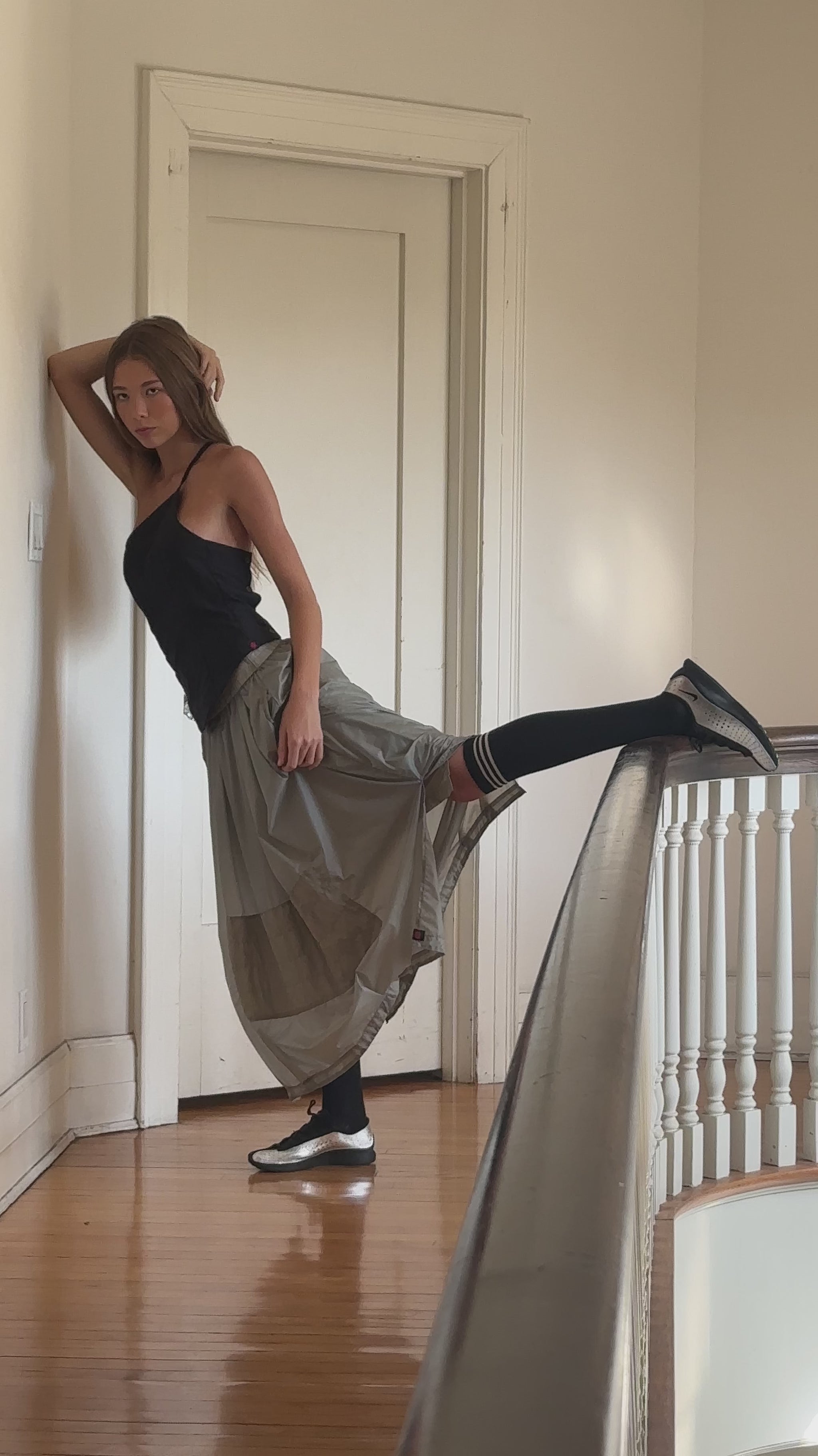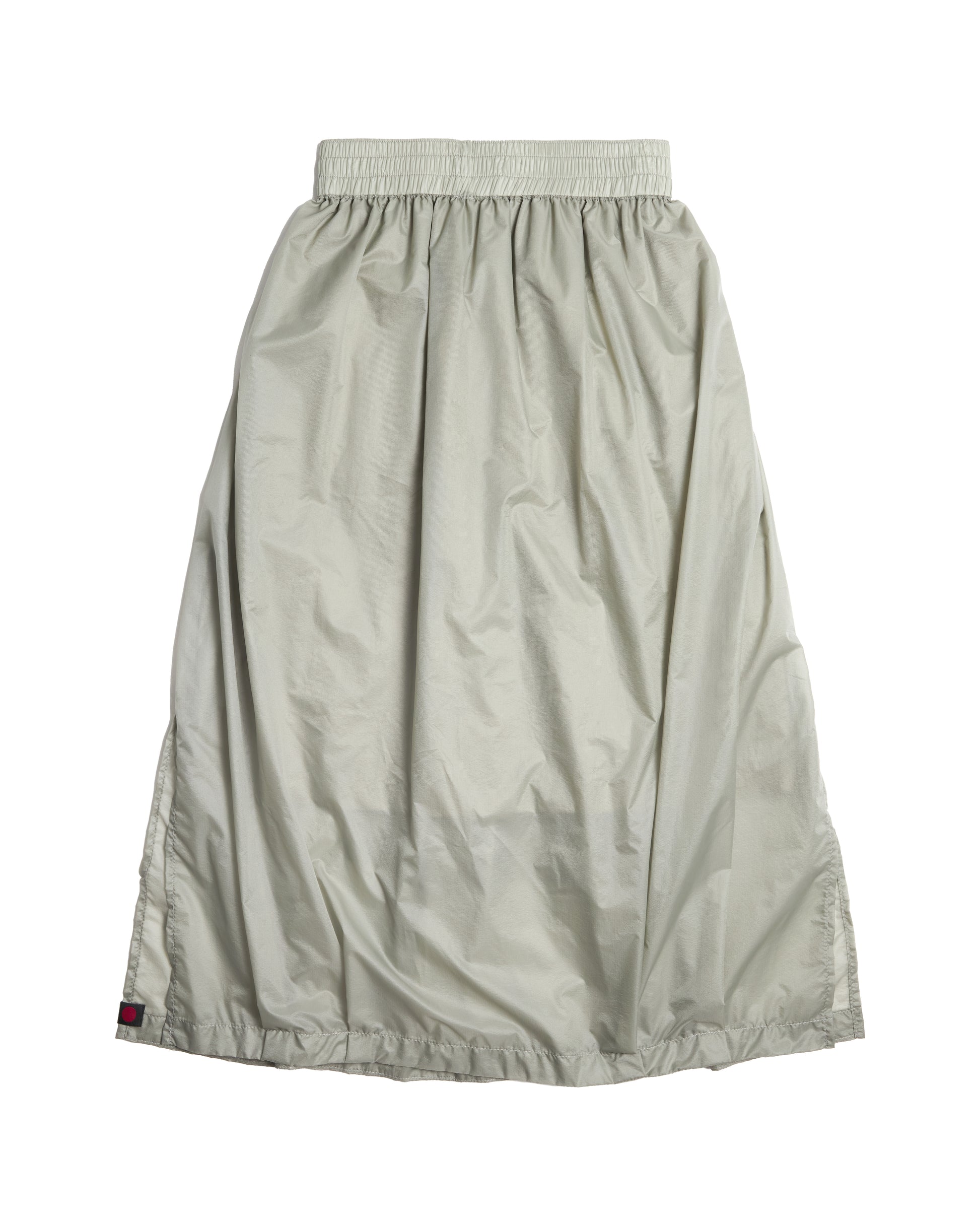 Sheer nylon Skirt with pleated waistline and hem. High slits at the hem and pockets at the side seams. Contrast patch and lining.